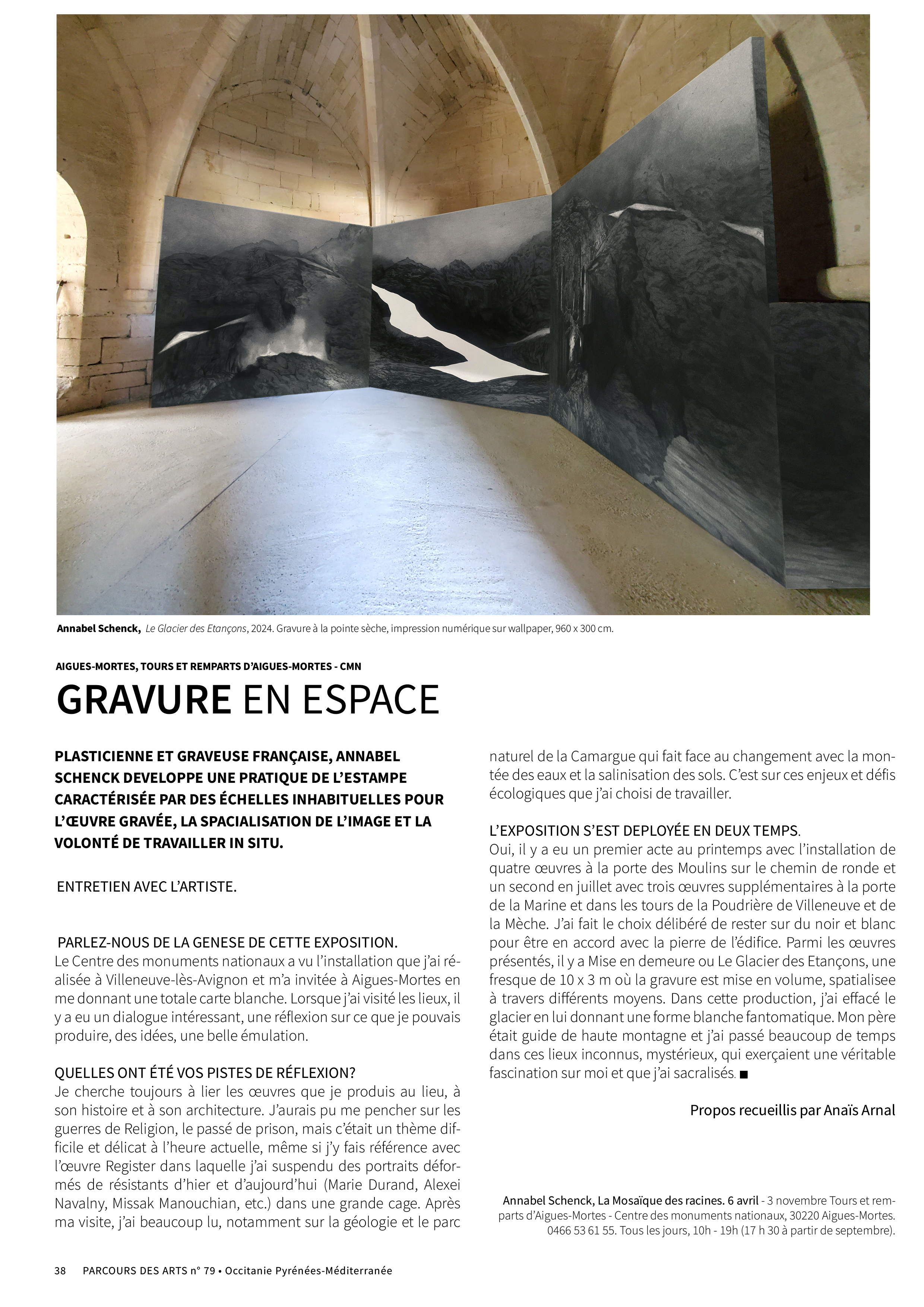 L'EXPOSITION S'EST DEPLOYÉE EN DEUX TEMPS. Oui, il y a eu un premier acte au printemps avec l'installation de quatre œuvres à la porte des Moulins sur le chemin de ronde et un second en juillet avec trois œuvres supplémentaires à la porte de la Marine et dans les tours de la Poudrière de Villeneuve et de la Mèche. J'ai fait le choix délibéré de rester sur du noir et blanc pour être en accord avec la pierre de l'édifice. Parmi les œuvres présentés, il y a Mise en demeure ou Le Glacier des Etançons, une fresque de 10 x 3 m où la gravure est mise en volume, spatialisee à travers différents moyens. Dans cette production, j'ai effacé le glacier en lui donnant une forme blanche fantomatique. Mon père était guide de haute montagne et j'ai passé beaucoup de temps dans ces lieux inconnus, mystérieux, qui exerçaient une véritable fascination sur moi et que j'ai sacralisés.