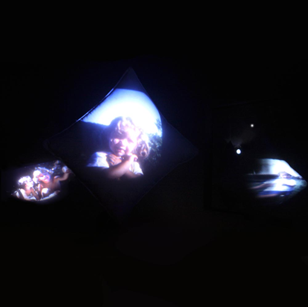 Par une mise en espace du paysage de mon enfance et des rêves dont elle est porteuse, je dresse un tableau pessimiste de mon activité artistique, de mes ambitions de devenir peintre, comme si je me posais la question : «Qu’est ce que cette petite fille est devenue ? Et que deviendra-t-elle ?» Les images apparaissent et disparaissent, projetées sur les oreillers qui tournent légèrement sur eux-mêmes, comme des pensées qui vont et viennent, sur ces repose-têtes où le sommeil ne donne pas toujours le repos. Et pour cause ! L’artiste – mais en suis-je une ? – subit une tension constante: emporté par sa passion il est dans l’obligation de créer. Ce pessimisme évoque bien sûr la crainte de la mort de l’inspiration, où de l’impossibilité de créer. Dans le noir de l’installation semble rôder la prière de Jonas dans Jonas ou l’artiste au travail d’Albert Camus: «Brille, brille, ne me prive pas de ta lumière». Jonas est l’artiste qui croit en son étoile, mais aussi l’artiste qui «meurt», prisonnier de son incapacité à créer. C’est probablement cette mort que je redoute et qui est mise en scène par ce travail. Camus dira lors d’une conférence: «Nous sommes en pleine mer. L’artiste, comme les autres, doit ramer à son tour, sans mourir, s’il le peut, c’est à dire en continuant de vivre et de créer.»