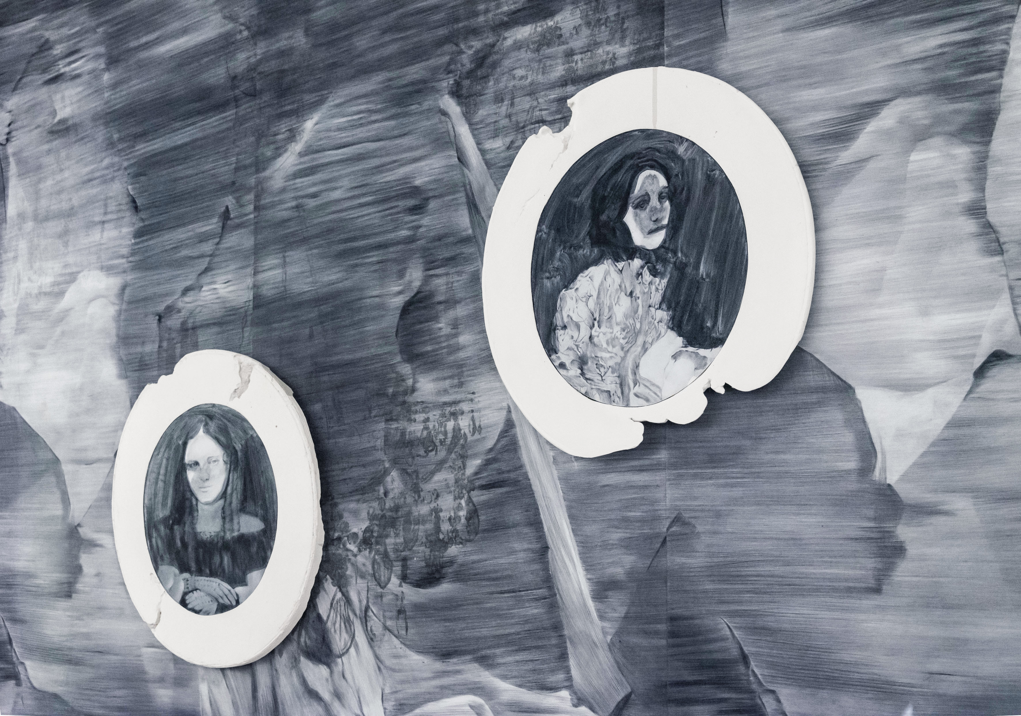 La fragilité du monde (détail) 2023. Installation composée de gravures, photographies et monotypes imprimés sur plâtre et papier peint, 550 x 300 cm.