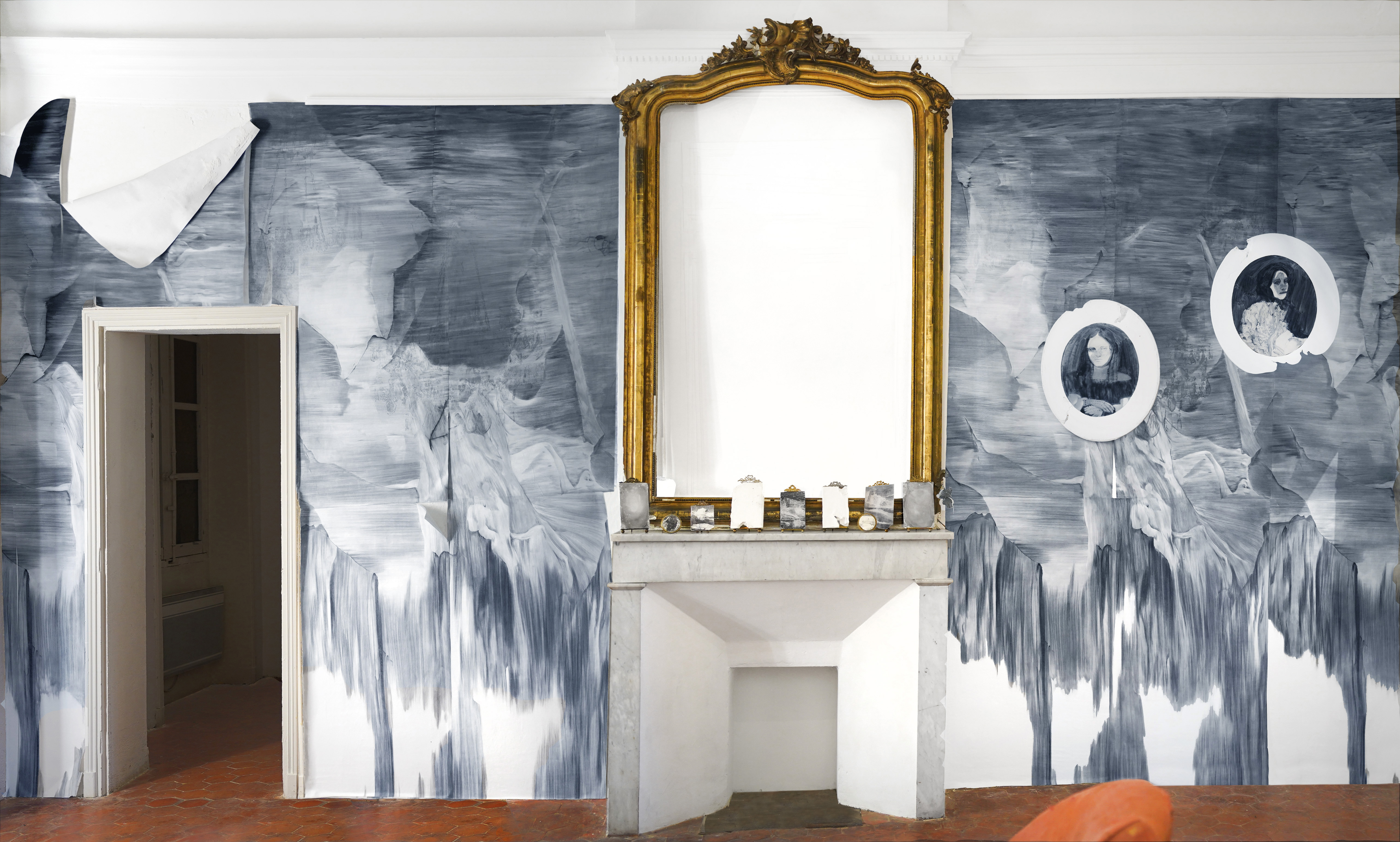 La fragilité du monde II, 2023. Installation composée de gravures, photographies et monotypes imprimés sur plâtre et papier peint, 550 x 300 cm.
