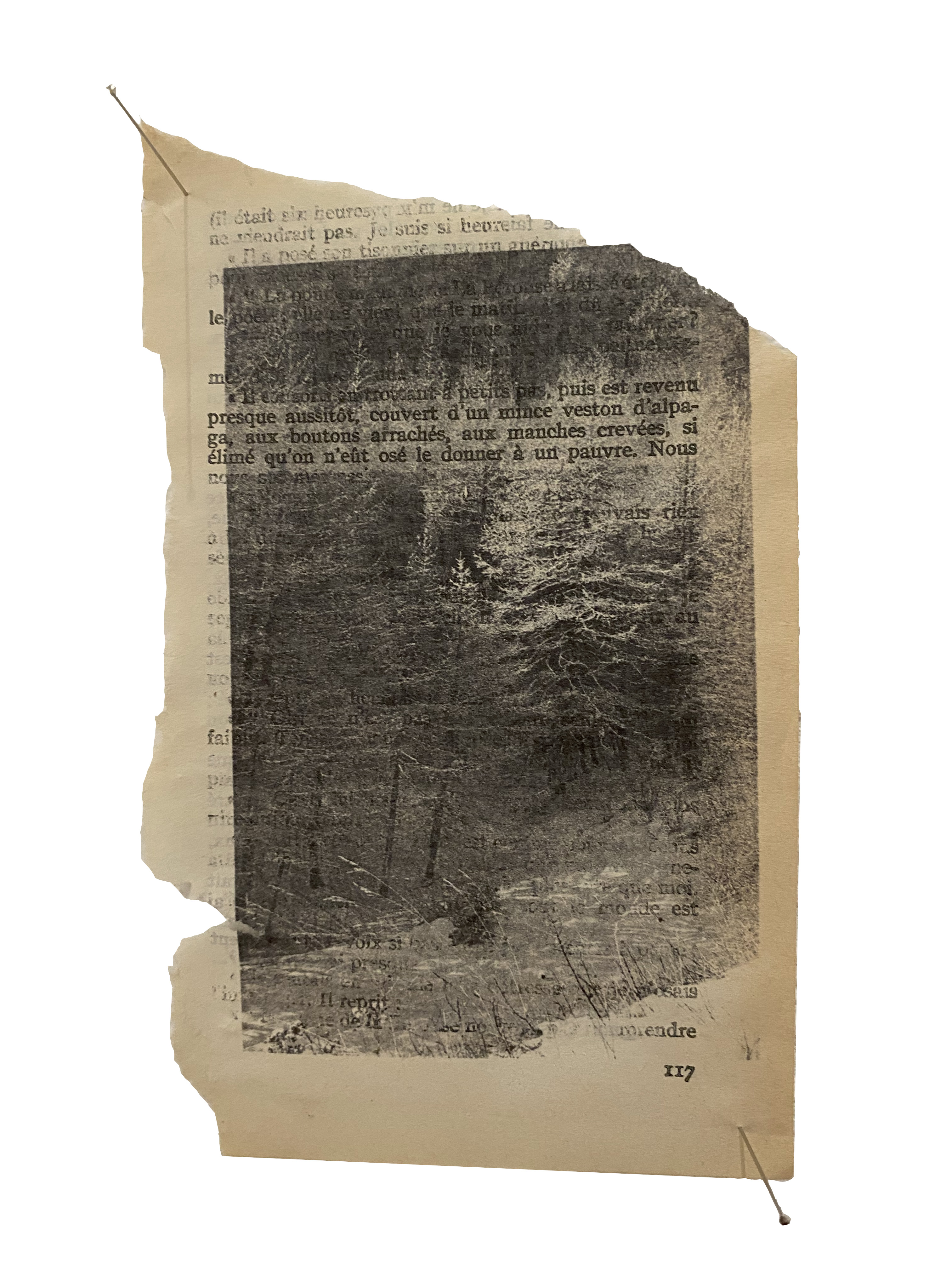 Quiconque a senti un jour de printemps sur les plateaux sauvages l’odeur amoureuse des fleurs de châtaignes comprendra combien ça compte de fleurir souvent (Jean Giono), 2023. Photogravures sur page du roman Le chant du monde, édition Folio de 1987.